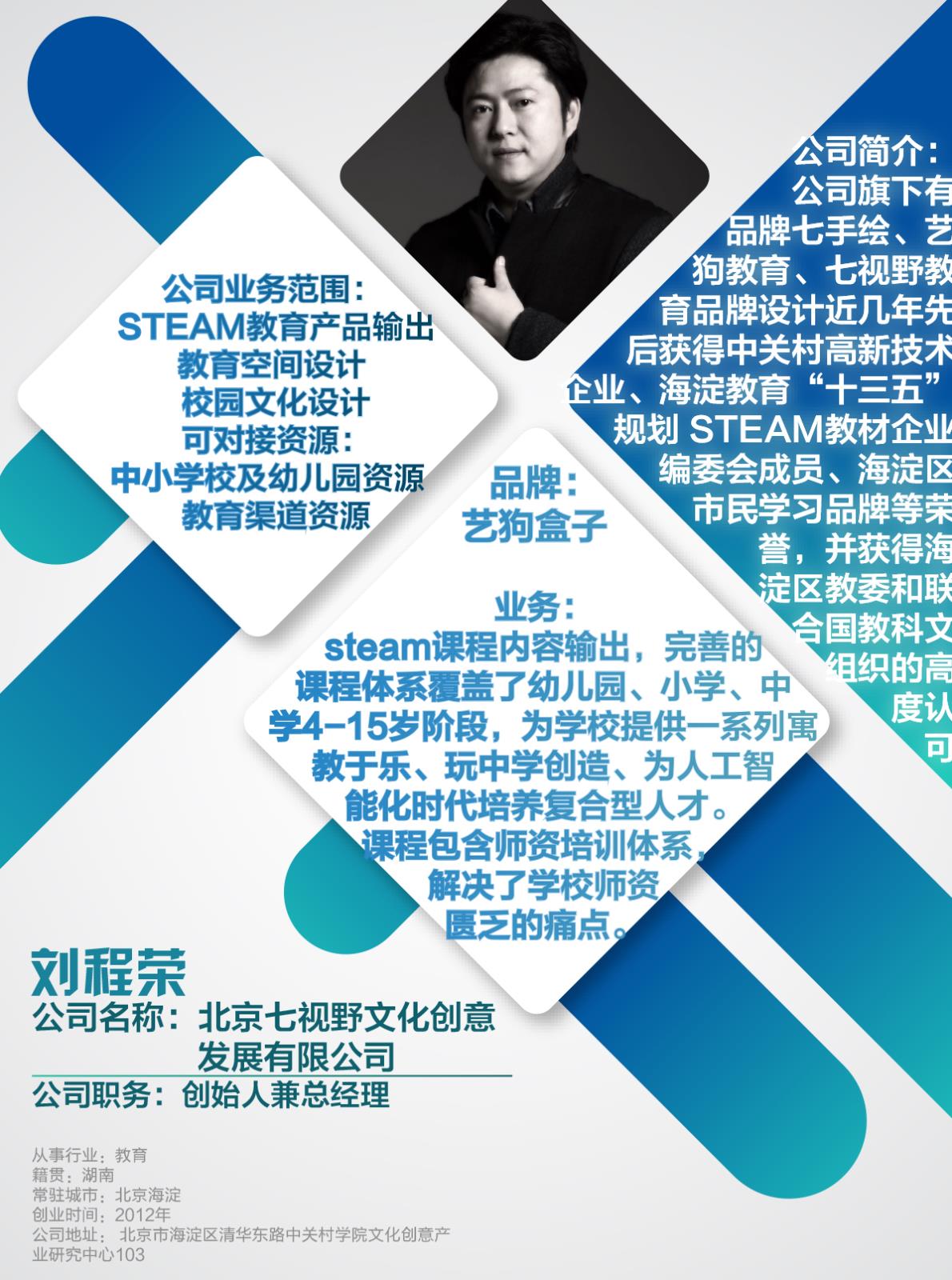 2019年3月14日晚上21点,北京湖南青年创业促进会(以下简称“青创会”)在2019青创会会员群进行了第十五次的会员自我介绍与故事分享活动。此次的活动由轮值副秘书长周才和陈秋平主持,分享了会员刘程荣的精彩故事。 会员刘程荣来自湖南郴州,出生于1983年,连续创业者,曾是某知名唱片公司艺人总监,演艺经纪公司创始人,(发行代表作:分开遗忘在相遇那天),2011年跨界从事教育行业,现在是北京七视野文化创意发展有限公司总经理。 刘总是学习音乐专业的,从事音乐行业近10年,2000年初,随着互联网的高速发展,人们开始网络免费下载歌曲,不再去购买正版唱片,所以中国唱片乃至全球最大的索尼唱片相继倒闭,各大小唱片公司开始转战演艺事业。刘总他们也曾坚持过三年多的时间,三年内公司旗下艺人发行了几张专辑,在南方有些传唱度,属于三线歌手,出场费也是几万不等,坚持了三年最终还是选择了放弃经营。 2011年刘总来到北京,最开始是想继续做文化产业,没想到误打误撞进入了教育圈,之后便开始从事教育行业,一做就是8年。刘总说,之所以能有教育行业的信心,离不开一直帮助过自己的教育圈伯乐。刘总他们做的是创新素质教育(STEAM教育),是国家有史以来最大强度推动教育改革,他们的产品专家顾问是国内外STEAM领域最顶尖的专家教师,第一位是中国STEAM白皮书写者,第二位是教育部装备中心课改专家,第三位是美国斯坦福大学教授,是他们这8年来一直默默支持者自己。